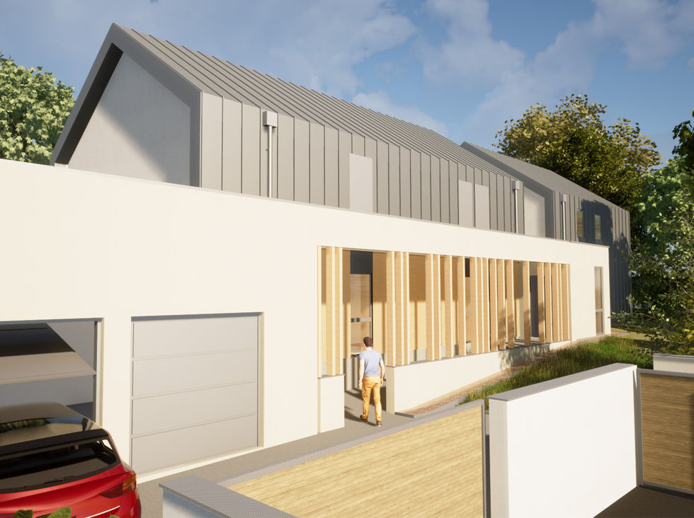 La maison se démarque des pavillons standardisés voisins par l'usage de bardage métallique en façade, matériaux économique qui associé à des bardages bois et un enduit plus simple sur les parties maçonnées offre une composition contemporaine.